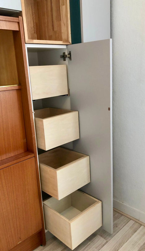 Structure du placard en mélaminé 19 mm, façades vert Niagara et gris perle. Les niches sont en Hévéa 18 mm sur lequel j'ai appliqué un encaustique maison à la cire d'abeille 🐝.